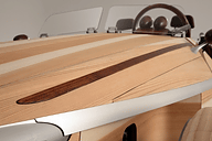 コンセプトカーはクルマとしての基本である、走る・曲がる・止まるといった性能も装備するため、構成部品となる木材も適材適所の樹種を選択。フレームは高い剛性を保つ「樺」、フロアは強度が高く耐久性に優れた「欅」、シートには木肌がなめらかな「栓」を使用した。