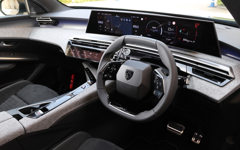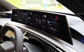 その核となるのは、進化した「プジョー パノラミック i-Cockpit」だ。21インチの巨大なモニターはドライバー側にゆるやかにラウンドしており、視認性や操作性の向上というメリットももちろんだが、とにかく迫力がある。またモニターの配置も、ダッシュボードに画面が浮かんでいるように見えるフローティングデザインがスタイリッシュだ。
