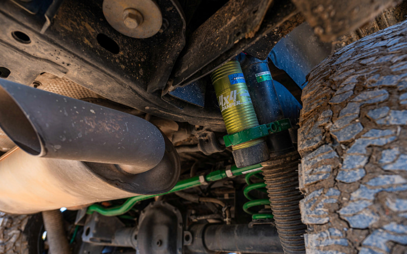 「4×4 DAMPER GRAVEL 2」は使用目的から車高を5~6cmアップし、それに合わせてロアアームも延長させキャスター変化を補正している。減衰力は16段の伸び圧同時調整式でショックアブソーバ―のストロークを稼げる別タンク式を採用する。別タンク式のメリットはオイル量を増やせるため耐久性が上がり、乗り心地もガス圧が低く抑えられ突き上げが減らせるなどメリットが大きい。