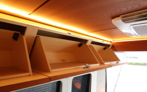 贅を尽くした室内は「大人が楽しむラグジュアリーな空間」を標榜するだけに、インテリアデザイナーが製作に携わった各所に欅を配したのもそのこだわりだ。広さを求めるより「贅沢な空間で快適に移動する」というのがカヤバ製キャンピングカーの目指すところだが、無駄な空間はなくドア付き収納スペースを各部に設けていることでキャビンを美しく広く見せている。またキャンピングカーには電源も欠かせない。高価で大きいが最適なバッテリを収納しているところも腕の見せどころだ。