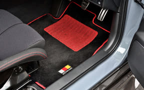 バケットシートはすっぽり身体を包む感覚で。インテリアは黒を基調とし、マットなどは赤の縁取りが施されている、ステアリングやセンターコンソールはカーボンが用いられているのも見た目にも印象的で触感もいい。