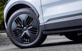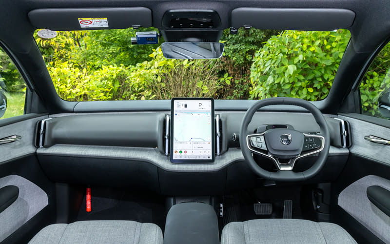 インテリアは一見するとあまりに素っ気なさ過ぎて、価格とのギャップを感じてしまう。しかし、その簡素な樹脂性のプラスチックや、デコラティブ・パネルと呼ばれるパイン柄の木目パネルにリサイクルPVCが使われるなど、今このEX30がボルボで一番カーボンフットプリントが少ないクルマであることを知れば、こうした簡素ささえもが魅力だと思えてくる。