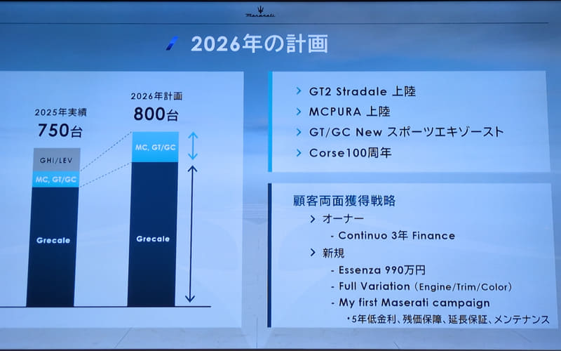 それに対し2026年の計画としては、ギブリとレバンテはもうソールドアウトで、今回紹介するMCプーラやGT2ストラダーレといったニューモデルや、新しいエキゾーストが装備されたグランツーリスモやグランカブリオ、もちろん主力のグレカーレの拡販を狙い、台数としては800台を目標にするという。