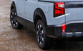 デリカD:5の外観ではブラックアウトされたフロントグリルが力強く、リアエンドに誇らしく入った「DELICA」の文字にブランド力の強さがうかがえる。前後ホイールアーチモールと前後のバンパー下部はアンダーガードを連想させる造形になり、オフロード感のあるデザインに統一されている。