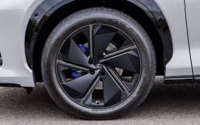 前後駆動力配分は45:55から80:20まで流れるように変化させ、コーナリングも滑らかだ。前後のタイヤサイズも変えている。フロントは235/50R20、リアは255/40R20のダンロップ「SP SPORT MAXX」を履く。リアのワイドホイールは視覚的にもグンと踏ん張る姿勢で頼もしい。