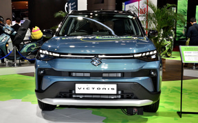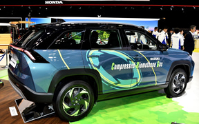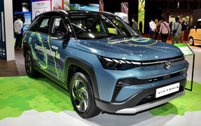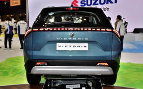 酪農廃棄物(牛糞)を資源化し、インド農村の活性化や各種社会課題解決への貢献と、カーボンニュートラルに向けたマルチパスウェイ実現の両立を図るためのインドでの取り組みの一環として、9月にインドで発表した「ビクトリス」のCNG(Compressed Natural Gas:圧縮天然ガス)/CBG(Compressed Biomethane Gas:圧縮バイオメタンガス)仕様車。タンクの収納位置を変更することで、ラゲッジを広く使えるようにしている。
