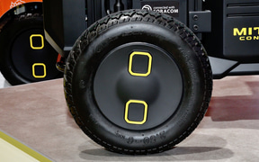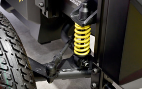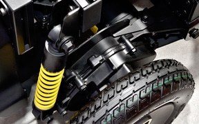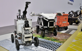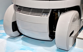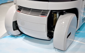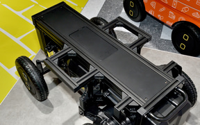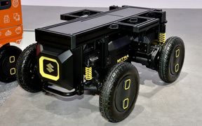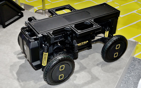 多様なロボットの足まわりとして活用できることを目指し、セニアカーの技術を応用して開発している電動ユニット。四輪独立サスペンションを採用し、走破性を確保している。