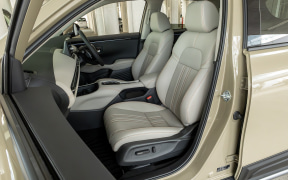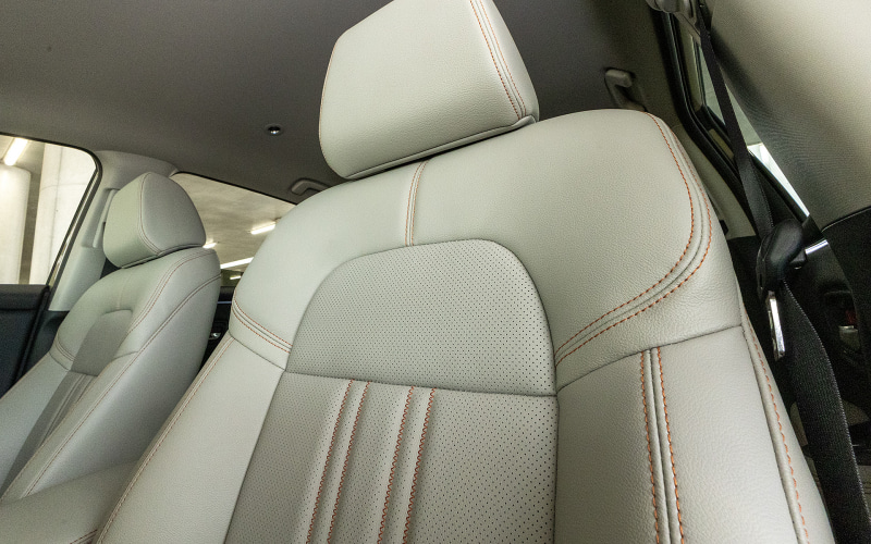 e:HEV Zクロスツーリングの内装色は、明るい系の「グレージュ」となり、シートは形状や機能に変更はないが、素材をグレージュの本革として、ステッチにオレンジ色を差し色として使っているのが特徴。グレージュとオレンジはともに明るめの色であるが、グレージュ単色より印象の違う明るさが入ることで、ワントーンのときより引き締まった明るさとなっている。また、クルマのシートという機能性が重要なパーツに対して、立体感を持たせることでサポート性のよさなども感じさせる効果もある。