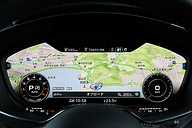 インテリアの注目ポイントとなるのが「アウディバーチャルコックピット」だ。その特長はアナログ機構を廃して12.3インチ、1440×540ピクセルの大型液晶を採用したことにある。GPUとしてNVIDIAの「Tegra 3」を採用し、スピード&タコメータはもちろん、「DIS(ドライバーインフォメーションシステム)」や「MMI(インフォテイメントシステム)」などを美しいアニメーションで表示することが可能となっている。