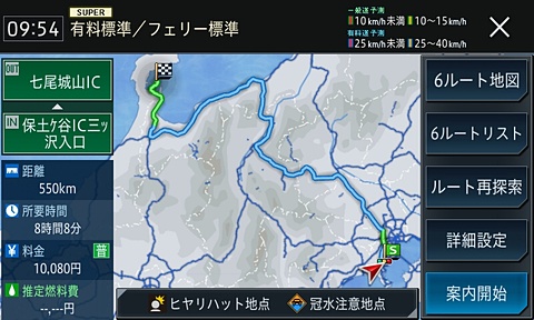 サイバーナビならでは、と言えるのが「スーパールート探索」だ。カーナビの場合、ルート探索は本体に収められたデータを使って行なうのが一般的。けれども、このスーパールート探索は通信機能を使ってサーバー側の膨大なデータを駆使。スマートループ渋滞情報やリアルタイムの交通情報などを加味しつつ、ナビ本体の処理ではマネのできないレベルの演算を実施。より最適で効率的なルートを導き出してくれる。そのバリエーションは「推奨/有料標準」をベースに「推奨2/有料標準」「推奨/有料回避」「推奨2/有料回避」「時間優先/有料標準」「幹線優先/有料標準」の計6パターン。通信を挟むため探索には若干時間がかかるものの、6ルート探索を行なってもそれほど待たされるといった印象は受けない。