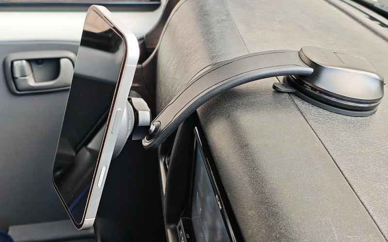 最近ではiPhoneでMagSafeの普及が進んだことで、マグネット式の車載ホルダーが多くなっている。磁石の力でさっと装着でき、ひねるとすぐ外れる。磁力が絶妙で、簡単に脱着ができる磁力がありながらクルマの振動では外れない。
