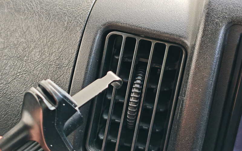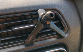一方のエアコン吹き出し口のマウントは、吹き出し口の形状や耐久性が合えばもっと簡単に装着できる。吸盤のように跡が付くこともない。