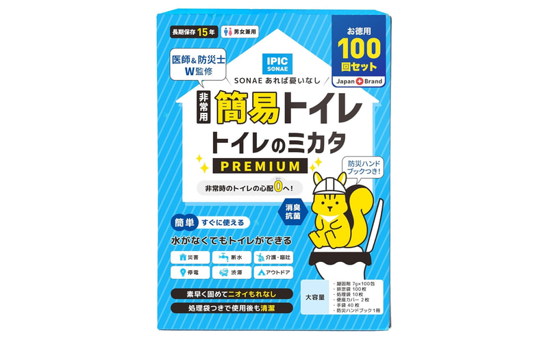 いろいろなメーカーから発売されているが、基本的にはオムツなどに使われている凝固剤と袋がセットになったもの。現在Amazonタイムセールでお買い得となっている「トイレのミカタPREMIUM」は、「凝固剤100回包」「排泄袋100枚」「処理袋10枚」「便座カバー2枚」「手袋40枚」「防災ハンドブック1冊」がセットになって、今なら48%OFFの3664円。