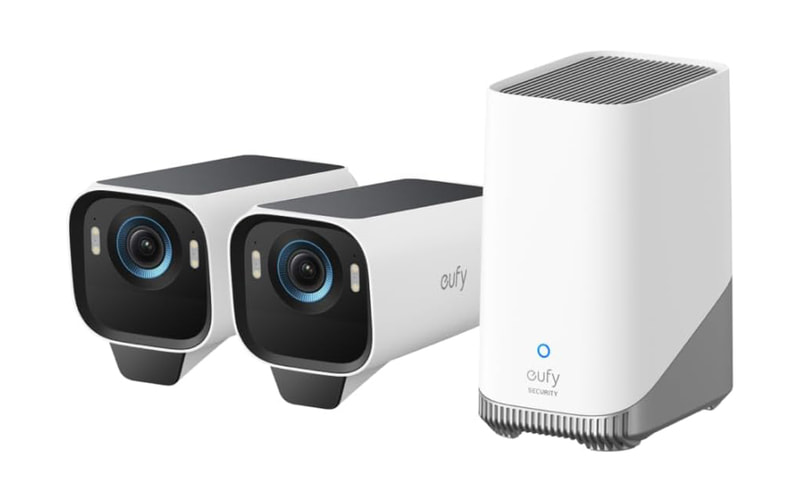 紹介するカメラとのセットは、eufyCam S3 Proが2台とHomeBase S380の組み合わせ。カメラはソーラーパネルとバッテリを搭載しているため、日当たりのよい場所に設置すれば、電源の配線なしで設置すればすぐ使える。