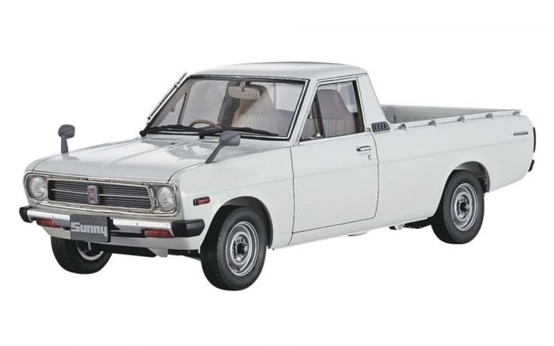 ハセガワの日産サニートラックは、超ロングセラーとなった2代目のB120型を再現。人気の丸目ヘッドライトは前期型と中期型だが、このモデルは1977年~1989年ごろまでの中期型のロングボディ、グレードはデラックス。細かいところまで作りこまれていて、エクステリアやインテリアだけでなく、荷台の補強リブは見えにくい下面まで再現している。