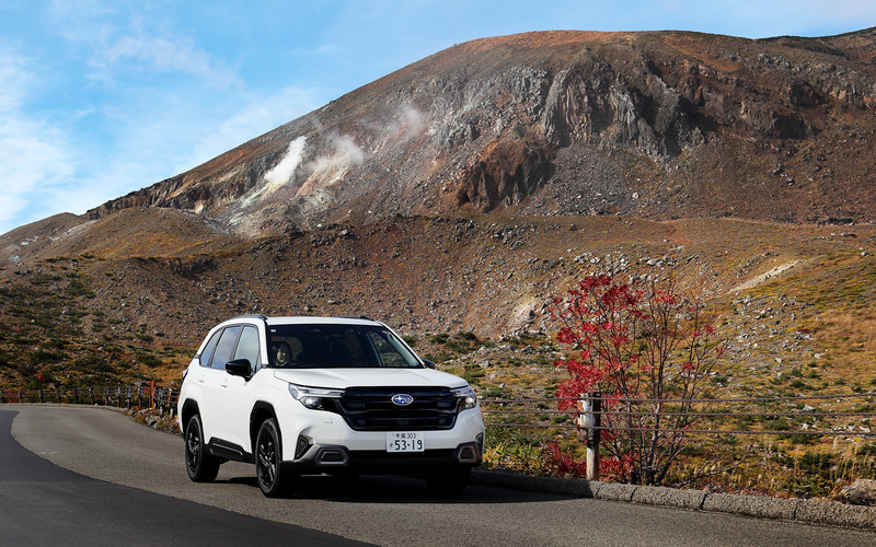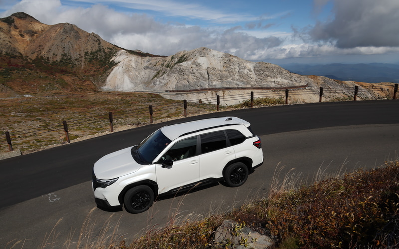 フォレスターの快適な乗り味と「アイサイトX」の手助けもあって、あっという間に目的としていた磐梯吾妻スカイラインへ到着した。フォレスターはワインディングロードでも大活躍で、急な坂道もぐんぐん登っていく。背が高く大きいクルマにも関わらずロール量は少なく、つづら折りも軽快に右へ左へと切り返し、山道も爽快に楽しく運転できた。