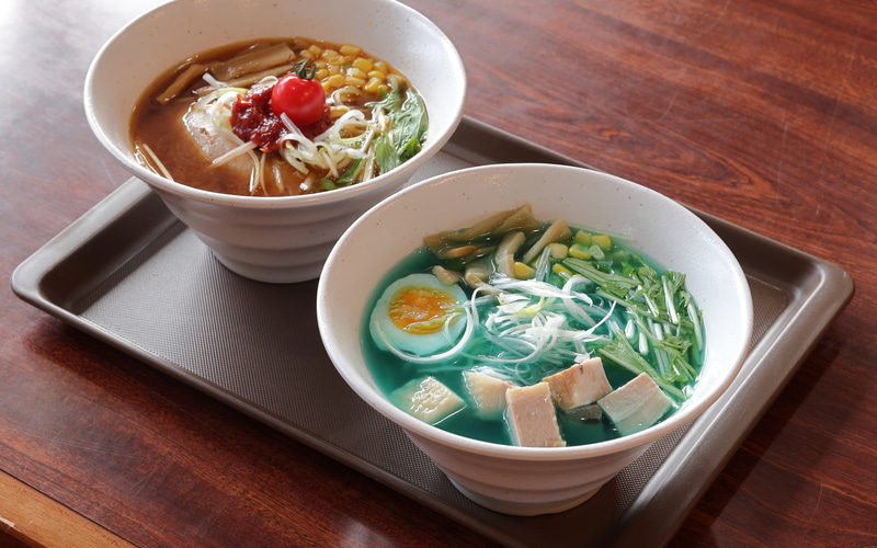 磐梯吾妻スカイラインの途中には浄土平と呼ばれる場所があり、レストハウスも用意されている。「もう少しこの景色をゆっくり堪能したい」と、休憩がてらレストハウスに立ち寄ることにした。レストハウスの2階では、雄大な景色を望みながら食事をとることができる。そこで発見したのは「魔女の瞳らぁめん」。福島の観光名所である五色沼(魔女の瞳)をイメージしたラーメンだそうで、なんとスープが真っ青! おそるおそる食べてみると、味はおいしい醤油ラーメンで、チャーシューも大ぶりだから食べ応え抜群。美しい景色と一緒にご当地の食事も楽しめて大満足の時間だった。