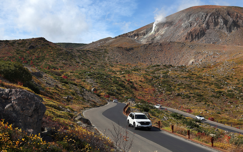 そんな道を登るにつれて、山肌は険しく雄々しい姿を見せ、その一方で山の木々は赤や黄色に美しく色づき始めているのが見て取れた。色とりどりの紅葉と、晴れ渡った真っ青な空のコントラストに、思わず「きれいだ」と息を飲んだ。平均標高1350mの磐梯吾妻スカイラインは、本当に空が近いように感じられる。険しい山肌からは火山ガスが立ち上り、まるで日本ではないかのような雄大な景色を見せていた。