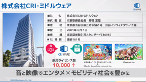 2001年8月に設立されたCRI・ミドルウェアは、さまざまなソフトウェアを開発するために利用される「ミドルウェア」を手がける企業。ゲーム業界をはじめ幅広く利用されており、1万以上のタイトルでライセンスが採用されているほか、モビリティ向けでも音声をミキシングする「CRI ADX Automotive」、デジタルメーターのリアルタイム映像などを描画する「CRI Glassco」といった製品をリリースして、車載製品としても累計1000万台以上に搭載されているという。