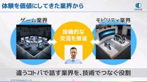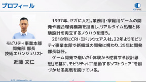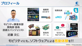 近藤部長はもともとゲームメーカーのセガに入社して家庭用ゲームなどの開発を手がけ、その後CRI・ミドルウェアに移籍してからは業務用カラオケ、知育玩具などの制御ソフトを生み出し、2022年からは現職のモビリティ事業本部で新領域開発を担当している。