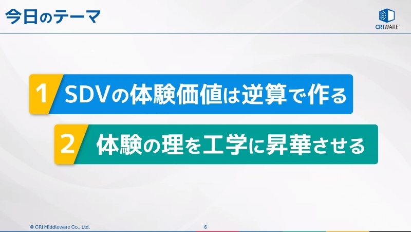 講演内容は「SDVの体験価値は逆算で作る」「体験の理を工学に昇華させる」の2つに分けられ、まずはSDVの体験を先行させ、実感した価値から正しいもの作りを逆算で作る手法について紹介された。