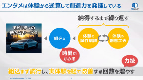 エンタメ業界ではこのような体験から逆算して想像力を発揮させていく手法は日常的に採られており、このような「体験的アプローチ」がモビリティ領域での新たな価値創造やサービス開発にも利用できると説明。このメリットとしては、新たなサービスを車両に実装する組み込みは時間がかかってしまうので、まずは実体験を行ない、ここでの実感を創意工夫で改善してまた体験するという試行錯誤を納得できるまで何回も繰り返すという力技によってクオリティを高めることができるとした。