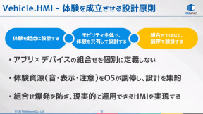 HMI WGでは、体験を成立させる設計原則として「体験を起点に設計する」「モビリティ全体で、体験を共有して設計する」「組み合わせではなく、調停で設計する」という3点を用意。HMIの設計では「何ができるか」ではなく「何を実現したいのか」を軸足として、すべてのアプリは一元的に管理されたルールのなかで動作することを基本としている。