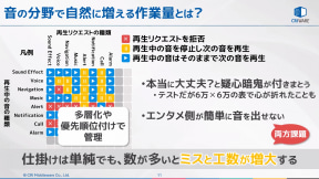 また、この状態はコンテンツを提供するエンタメ側の立場から見ると、サウンドを増やして音を鳴らすことがミスや工数の増大につながり、気楽にできなくなってしまうと説明。SDVの時代にさまざまなコンテンツが増やしていきたい部分とマッチしない構造で、単体で見ればシンプルな仕組みでも、組み合わせが増えるとミスを防ぎきれなくなってしまう恐れがあるとした。