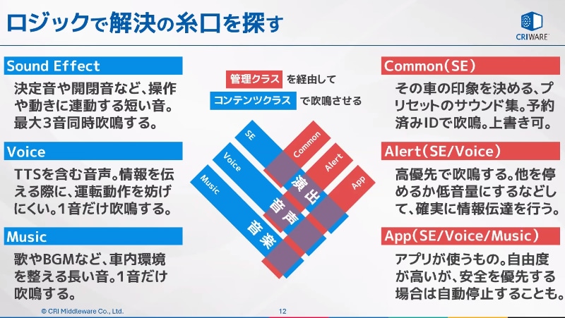 この課題をロジックで解決するため、HMI WGでは組み合わせの処理を「管理クラス」と「コンテンツクラス」に振り分けて制御する仕組みを採用。コンテンツでは乗員の操作や車両の動作を分かりやすくする短音を同時に3つまで吹鳴させる「サウンドエフェクト」、ナビ音声やテキストメッセージの音声読み上げなどの情報を1つだけ吹鳴させる「ボイス」、BGMや動画コンテンツの音声などを1つだけ継続的に流す「ミュージック」などを想定。コンテンツを制御する管理側では、車両の印象を決めるプリセットサウンドで上書き可能となる「コモン」、高優先で吹鳴し、ほかの音を停止、または低音量にして確実な情報伝達につなげる「アラート」、アプリなどを含めてさまざまなコンテンツを扱い、設定の自由度が高い「App」を用意して、個別の組み合わせではなくクラスごとの制御を行なう。