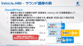 サウンドエフェクトの例では、同時に3つの効果音を吹鳴可能な車両の場合、すでに3種類の効果音が鳴っている状態で4つめの効果音を吹鳴させる必要が出てくると、「後出し優先」の法則で3種類のどれかを止めることになり、最も優先度が低い効果音が停止して新たな効果音が吹鳴する制御が行なわれるという。このような部分も積極的にユーザーの体験価値として訴求されるようになれば、HMIを競争領域にできるかもしれないと紹介した。