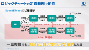 具体例としてはCRI・ミドルウェアでも日常的に扱っているサウンド関連の制御について紹介。HMIでもさまざまな音源を扱うことになるが、「再生リクエストの種類」と「再生中の音の種類」の組み合わせで、新たなリクエストが発生したときに再生中となっている音を鳴らし続けるのか、音を停止するのか、または再生中の音を優先してリクエストを拒否するのかといった組み合わせを多層化や優先順位付けで管理する仕組みにすると、組み合わせが増えるに従って正しい動作を実現できているのか不安になってしまうという。自身でも6万×6万という組み合わせ表を目にして心が折れた経験があると語った。