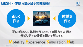 日本の自動車業界ではすでに「正しく作る」手法は確立されており、これからは「体験を作る」領域を強化していくことが求められている。このために「何がよい体験なのか?」を実際に体感したいというニーズがあり、それは開発側でも同様で、MESHを「よい体験」を見極めていくための場所にしたいと述べた。