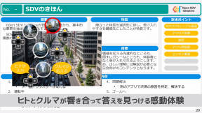 MESHを活用する例としては、SDVの車両が走行中に渋滞に巻き込まれたシチュエーションを紹介。体験者は車載されたコントローラーのスイッチを操作して、自車の前にいる車両に装着されているドライブレコーダーのカメラ映像をディスプレイなどに表示。この操作を繰り返してどんどん前方の車両に切り替えていき、最終的に最前列と目される車両の前方に事故や故障による停止車両が存在して、渋滞原因になっていることを確認できるといったこれまでにない運転体験をシミュレーションで再現できるという。このようなMESHはすでに製作されて展示会などで公開され、将来的な技術のよしあしや使い勝手について来場者に体験してもらっていると紹介された。