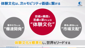 後半ではHMI WGでも注力している、体験を競争力に変えて文化として昇華させる取り組みについて解説。モビリティのグローバル市場ではさまざまな手法で次世代をリードしようという取り組みが進められているが、近藤部長は日本人が得意としているのは技術の精度や思慮の深さであり、“おもてなしの心”に代表されるような「体験文化」ではないかと指摘。近年ではインバウンド需要などでも大きく注目されている部分で、このような「体験文化」の標準化によって世界をリードできるのではないかと述べた。