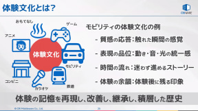 日本を訪れた外国人観光客にはゲームやアニメ、コンビニなどが体験文化として注目されているが、これをモビリティの視点から見ると、クルマに触れた瞬間に感じる「質感の応答」、映像などの動きや音などに統一感を与えた「表現の品位」、乗車して降りるまで迷わず進める「時間の流れ」、運転後に楽しかったと振り返ることができる「体験の余韻」といった要素が大切になると説明。このような「体験の記憶」を再現し、改善しながら継承していくことで積み重ねたものが歴史になっていくとした。