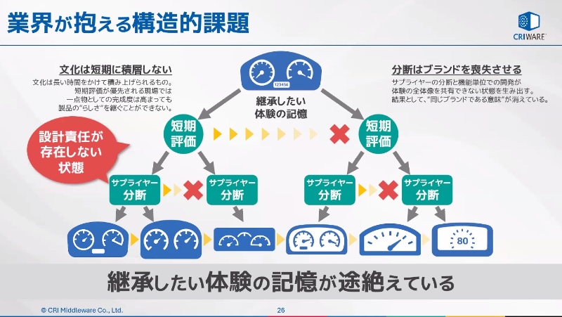 しかし、日本の産業界の現状では「評価制度の短期化」「サプライヤー構造の複雑化」などによって体験価値の継承や文化としての積層が途絶えがちになっていることが課題になっていると指摘。要求仕様を分解して機能単位で開発するスタイルは生産効率の向上を目指すことができる一方、ブランドの核となる体験文化の継承を困難にしているとの考えを示した。
