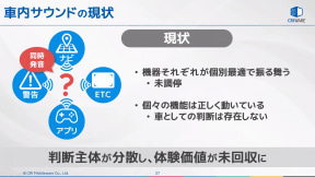 車内のサウンド制御でも、現状では車両自体の警告や装着するカーナビ、ETC車載器、アプリなどがそれぞれ個別に最適とする動作を行なってあまり調停されておらず、個々としては適切でも1台のクルマとして見た場合には統一された判断が存在していないことを問題として指摘。判断主体がバラバラになっていることで回収可能だった体験価値が未回収のまま消えていると説明した。