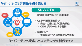 これをHMI WGでも進めているようなビークルOSが主体となって優先順位を判定する技術を導入することで、機器ごとの吹鳴要求をビークルOSが調停。統一された基準でサウンドの使い分けが実施されて乗員の体験価値が向上するという。この状況ではCRI・ミドルウェアのようにエンタメコンテンツを提供するサードパーティのアプリは吹鳴が遮断されるケースも増えることになるが、サードパーティ側の立場としても警告などが行なわれるシーンでは吹鳴を遮断してほしいと考えており、判断をビークルOSに任せることで自由に安心してコンテンツ制作が行なえるようになると明かした。
