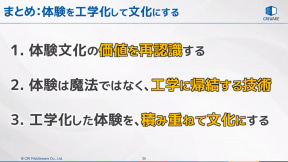 また、体験は魔法ではなく、突き詰めて考えていけば工学に帰結する技術に昇華できると説明。工学化された体験を積み重ねていくことで必ず文化になり、文化を積み重ねることを大事にしてもらいたいとコメント。「次の体験はぜひあなたの手で作っていただきたい」と講演を締めくくった。