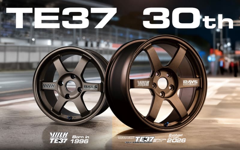 レイズは2026年でTE37が誕生30周年を迎えるのを記念して、初代TE37へのオマージュも含めた記念モデル「TE37 30th Anniversary」を発売。カラーは当時と同じ「ブロンズ」「ホワイト」の2色を設定しつつ、スポークロゴは、レイズの特許技術「A.M.T.(ADVANCED MACHINING TECHNOLOGY)」による切削ロゴか、初代モデルと同じステッカーロゴを選択できる。