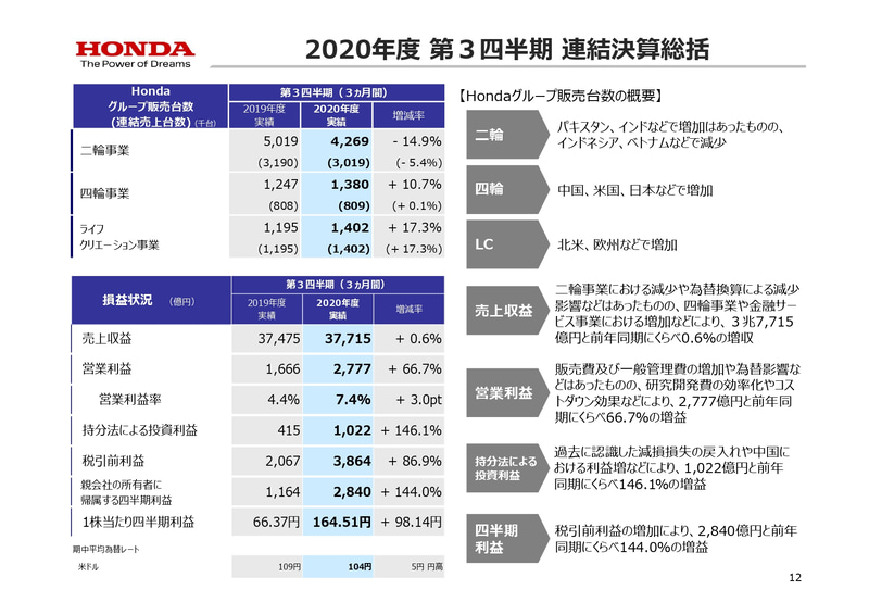 • ホンダ、2020年度第2四半期決算発表 営業利益が黒字化して前年同期比でプラスに