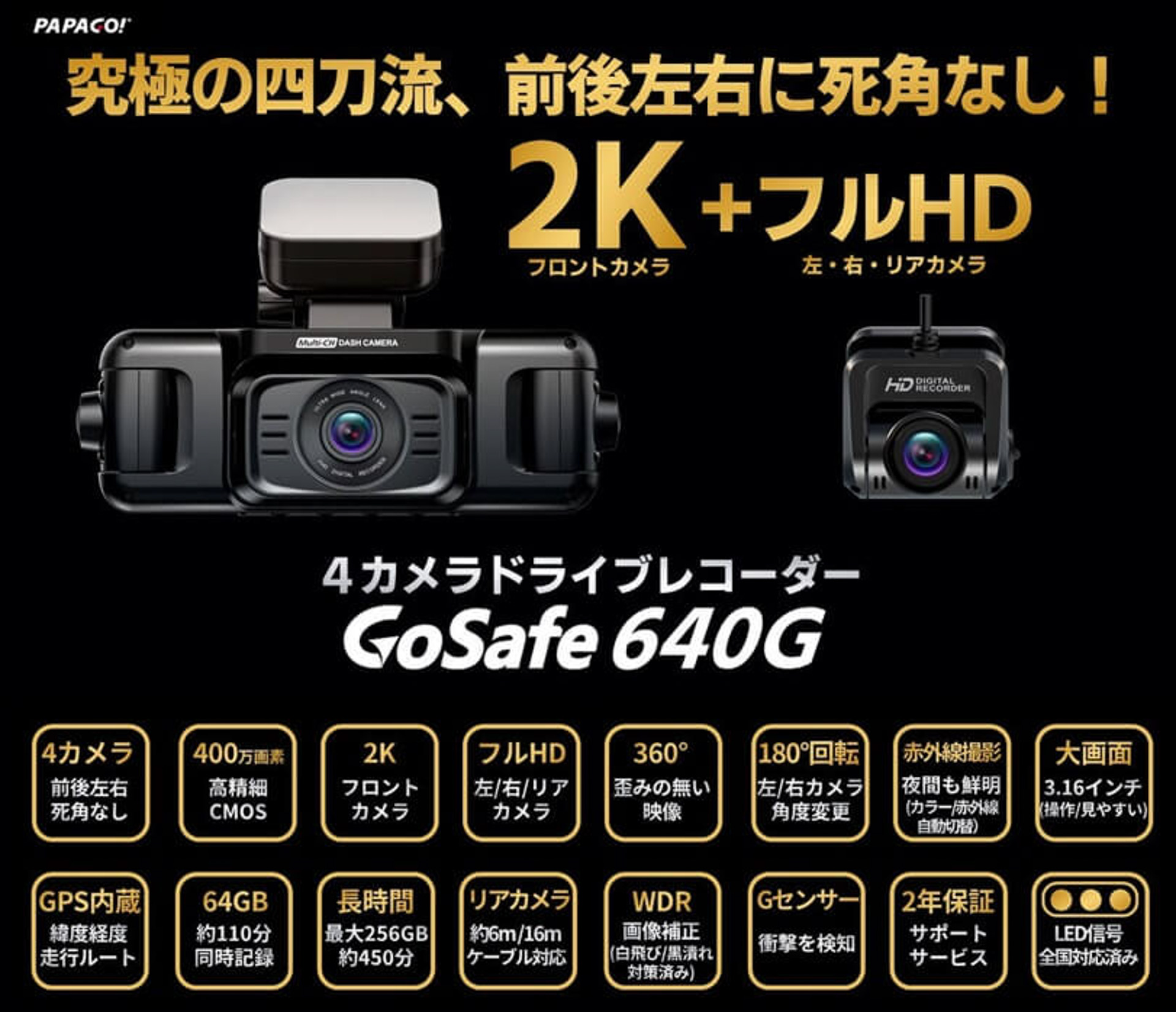 パパゴジャパン、合計490°を録画する3カメラドライブレコーダー「GoSafe 490GM」
